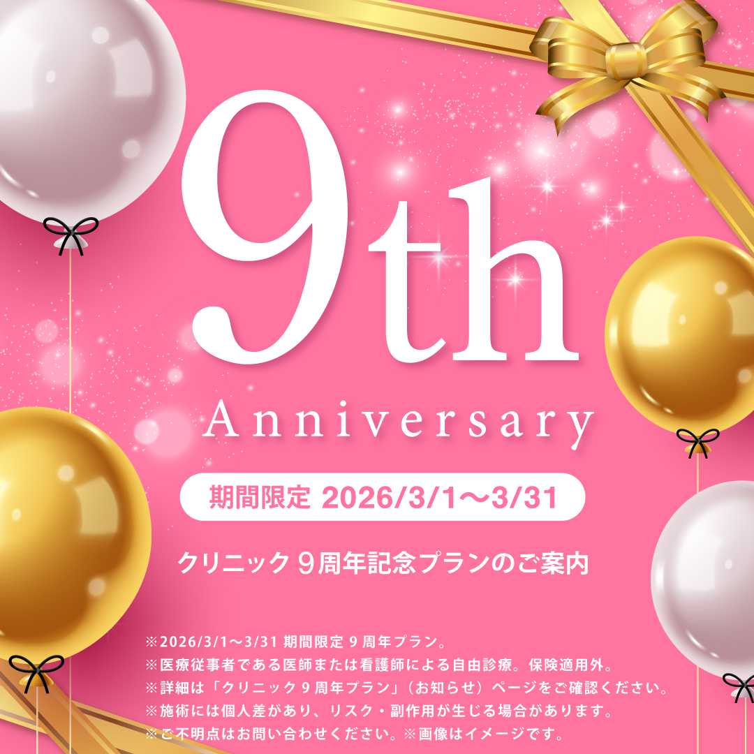 ※治療内容・費用・リスク等の詳細は「クリニック9周年プラン」(お知らせ)ページをご確認ください。