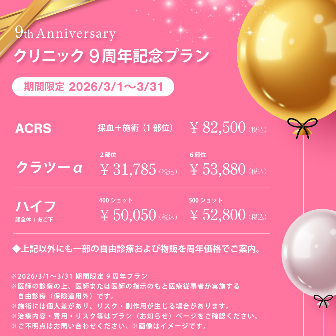 ※対象外:ヒアルロン酸分解注射(ヒアルロニダーゼ)、ヒアルロン酸注射(韓国製ニューラミス)、遅延型フードアレルギー検査、ピアス、手術料金(スレッドリフトは対象です)、点滴、注射、内服薬、医薬品、併用メニュー、オプションメニュー、コース料金