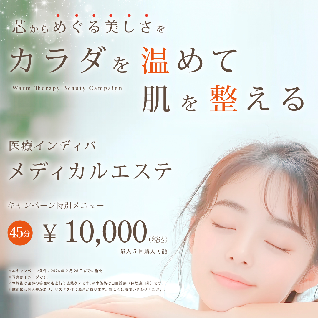 カラダを温めて、肌を整える。医療インディバで、芯からめぐる美しさを。